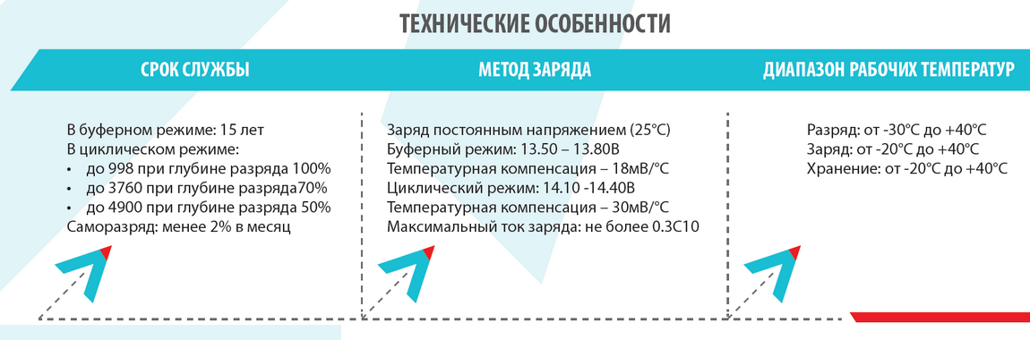 Отличительной особенностью данных аккумуляторов является изготовление по технологии гель, не гибридный аккумулятор, как у других производителей, где смешиваются технологии AGM и гель, а между пластинами заливается загущенная до гелевого состояния серная кислота. Это позволяет получить прекрасные характеристики в части цикличности и долговечности.
