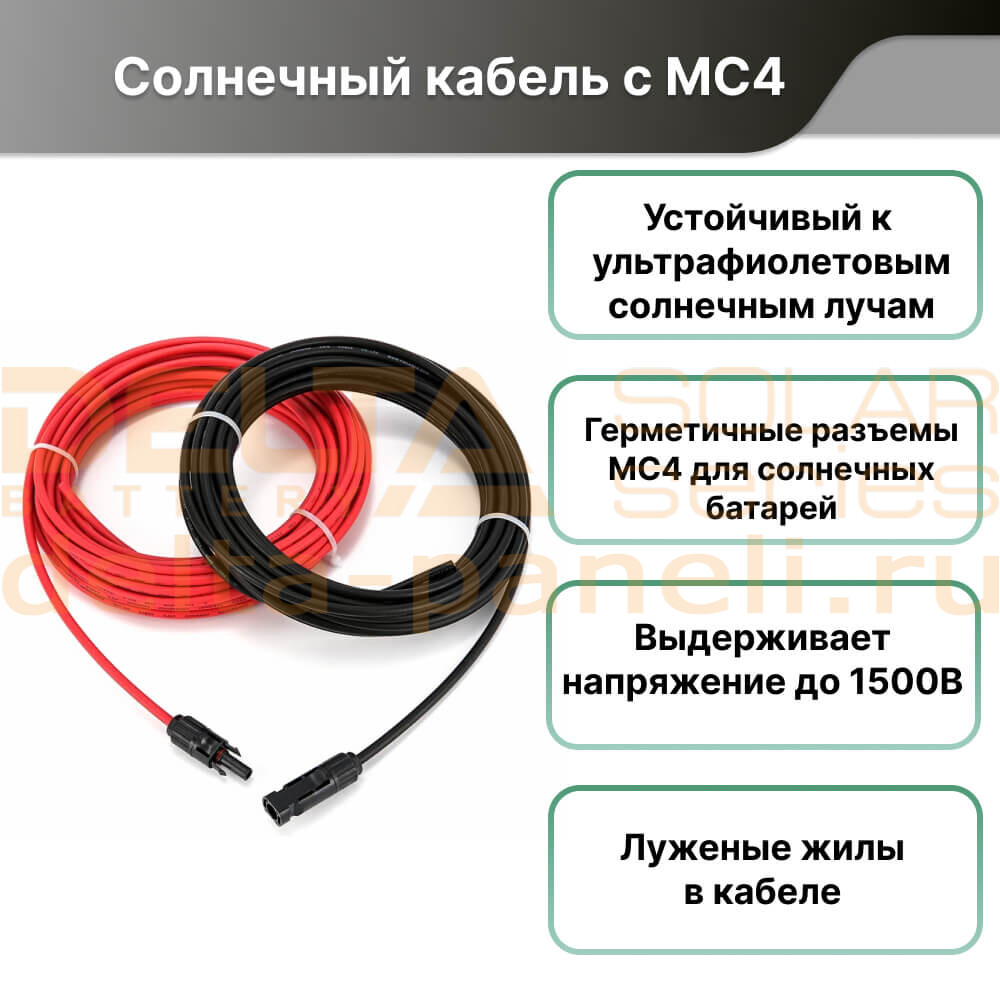 Комплект солнечного кабеля с обжатыми на концах коннекторами МС4. Используется для соединения контроллера заряда и солнечной панели. С одной стороны кабеля находится коннектор MC4, с другой - специальный наконечник (типа "гильза") для соединения с контроллером. Коннекторы обжимаются профессиональным инструментом для обжима МС4. Кабель состоит из 2-х жил и комплекта разъемов MC4 - "папа-мама".